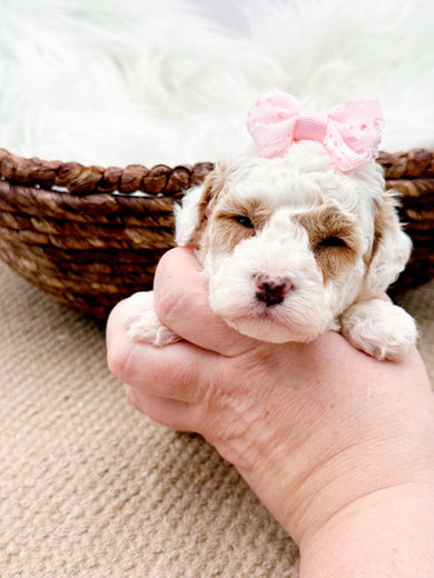Their mom is an F1b Cavapoo & dad is a Mini Poodle. Both parents are around 11-12lbs. Our puppies are all raised with children and around other animals. They are very well socialized and family raised. Each puppy will come with their own puppy starter kit which contains a collar/leash, toy, treat, food sample, CKC application, 1yr health guarantee with spay/neuter contract, veterinarian examination, current vaccinations/deworming.